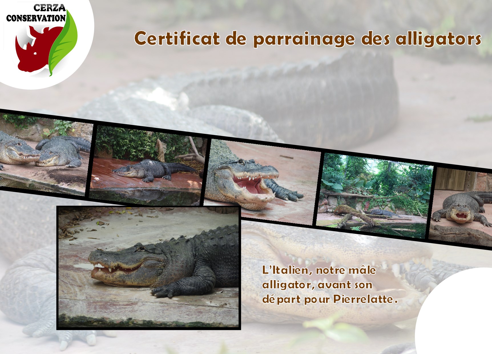 | animal | Alligator, Gibbon, Girafe, Guépard, Hippopotame, Lémurien, Loutre, Loup, Ours polaire, Panda roux, Rhinocéros blanc, Rhinocéros indien, Tapir, Tigre, Lion |
